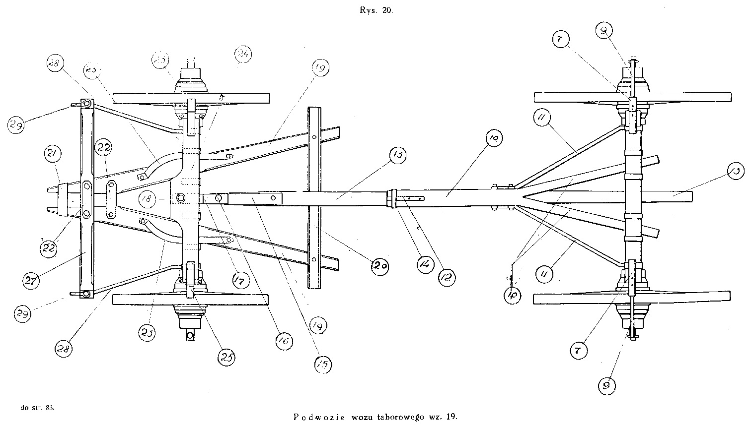 Średnia osi jest okryta z wierzchu progiem przednim. W środkowem wcięciu progu umocowana jest sworzniem skrętu kuna rozwory; wcięcie to jest zabezpieczone przed wycieraniem przez okucie z blachy. We wcięciach bocznych są osadzone śnice (19). Na śnice jest nałożona odpowiedniemi wcięciami ławka przednia. Związanie osi, progu i ławki jest takie same, jak w tylnej części podwozia. Tylne końce śnic złączone są podymą (20), okutą z wierzchu blachą. Podyma opiera się górną swą powierzchnią o przechodzącą ponad nią rozworę, usztywniając w ten sposób całe podwozie w kierunku pionowym. Przednie końce śnie uchwycone są w opaskę (21) oraz w dwie kuny wpustu dyszlowego (22), Do śnic przykręcone są żelazne łuki zwrotnic (23), oparte w środku na ławce. - Śnice wraz z podymą tworzą trójkąt, którego wierzchołkiem jest wpust dyszlowy a podstawą podyma.