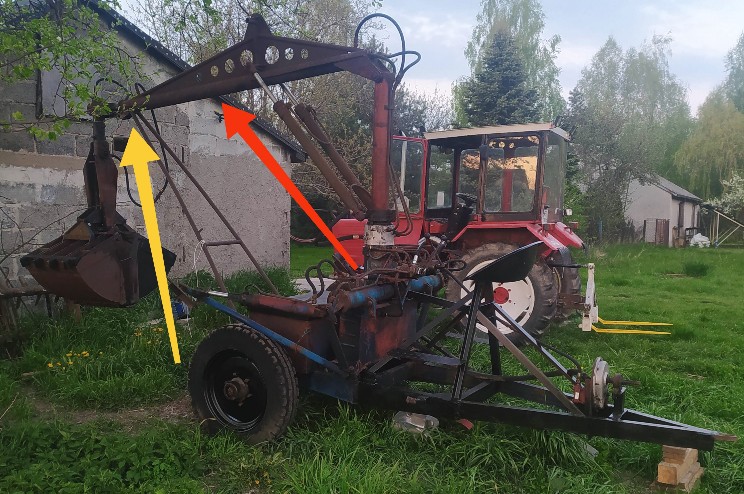 Pisze o siłowniku poprzecznym teleskopowym, ten który wysuwa łyżkę/widły do przodu zwiększając zasięg. (Czerwona strzałka) a cieknie tam gdzie jest żółta strzałka, w sumie cieknie to dość optymistyczne stwierdzenie, leje się jak ze szmaty, jak pisałem stało to dobrych 10lat, co tam było wlewane tego nie wie nikt, i nie będę w to wnikał, chce wymienić wszystkie uszczelnienia w każdym siłowniku, tylko jak się dobrać do tego poprzecznego, mam jakąś myśl, tylko nie wiem czy będzie słuszna, na pewno zdemontuje łyżkę, od strony kolumny obrotu jest jakieś 5 czy 6 śrub, może one jakoś trzymają ten siłownik, myślę że to będzie ciężkie bydle, mam obawy czy sam podołam.
