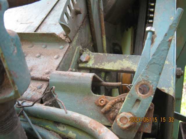 Karbowany pręt byl przykrecony dwoma srubkami co jest dobra wiadomoscią, ze poprzedni rolnik nie miał spawarki. Posiadał za to sprawna smarownice i czas do smarowania, nawet tam gdzie trzeba zdjac pokrywy aby miec dostep do kalamitek jest swiezy smar. Linka gazu wyglada jak oryginalna i jest zakonczona haczykiem. Manetka gazu ma trzy polozenia na zatrzasku co chyba bedzie: wolne obroty, obroty dojazdu na pole i obroty pracy. Musze teraz obliczyc przelozenia silnik-młocarnia i ustawic regulator na takie obroty by uzyskac ok 1000 obr/min na mlocarni?