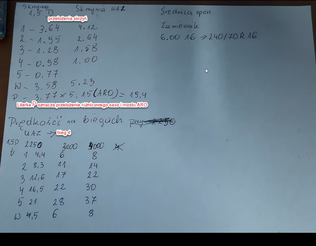 Dlatego przy skrzyni saxo zmniejszam to prawie 4-ro krotnie, dokładne obliczenia to dolna część zdjęcia po włączeniu w uazie 4 biegu i sterając skrzynią saxo.