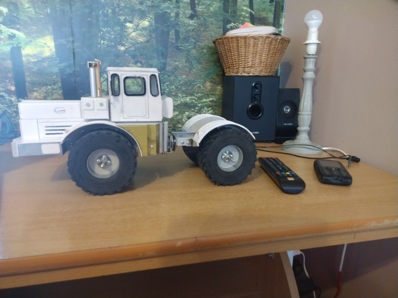 Witajcie. Dzisiaj wystrugałem pierwsze z kół szerokość 43mm wysokość 108, opona to pełna guma a waga to 0.5 kg czyli na same koła będzie 2kg i jestem ciekawy jak wytrzymywać to będą przekładnie zastanawiam się czy na układ kierowniczy wystarczy serwo 35kg domówiłem też BEC zewnętrzny do 6A Najwyżej jak będzie coś nie tak to wstawię siłowniki i hydraulikę. Wstawiam fotki potworka z jednym kołem i ursusa 1604 w tej samej skali dla pokazania jakie to są różnice i jaki to grzmot wielki