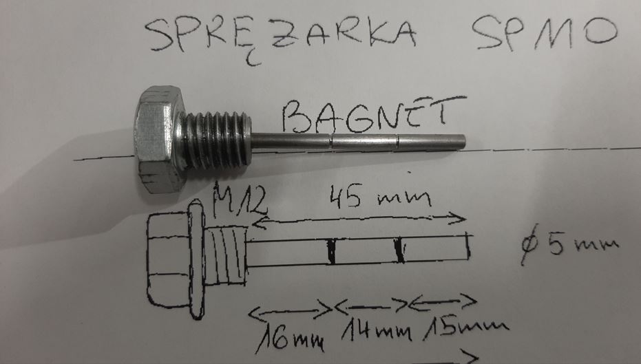 W sprężarce brakowało bagnetu wskaźnika poziomu oleju, i zamiast niego była zwykła śruba. Trzeba było bagnet dorobić. Dzięki pomocnym materiałom pana Pawła wymodziłem coś takiego. Nie jest to oryginał, ale działa.