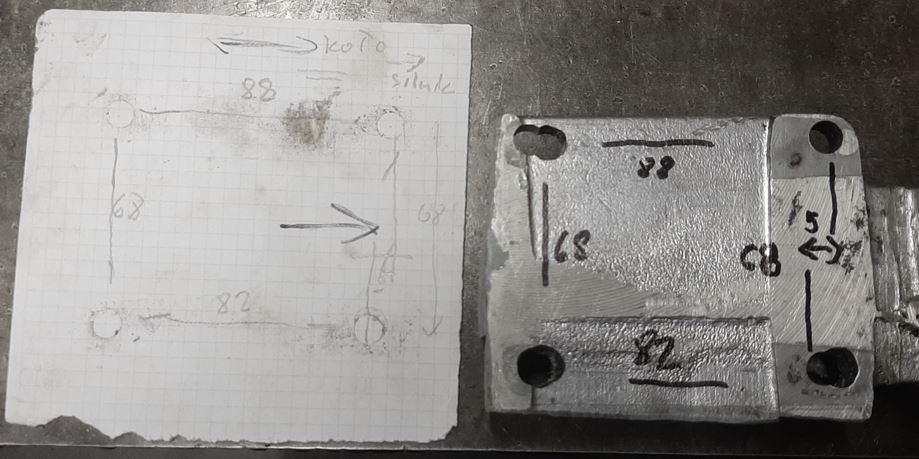 Przełożyłem to na mój wspornik i dało się taki układ otworów przewiercić - jest gdzie. Posadziłem ten wspornik na frezarkę w której mam DRO i trzy otwory przefrezowałem tak jak ma być. Oczywiście razem z istniejącymi otworami zrobiły się jaja, ale podkładki załatwiły sprawę.
